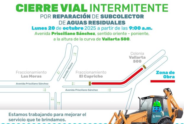 Este lunes realizaremos la reparación de una línea sanitaria en Av. Prisciliano Sánchez, a la altura de la curva de Vallarta 500. Habrá cierres intermitentes en sentido oriente–poniente. Agradecemos tu comprensión y te pedimos tomar precauciones