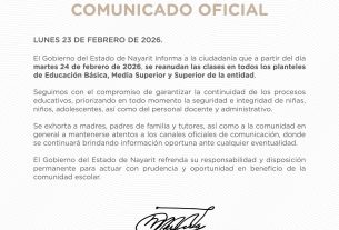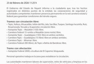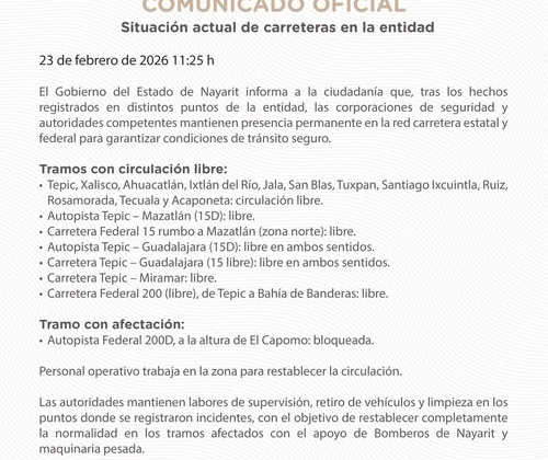 Tepic, Nayarit; 23 de febrero de 2026, 11:25 horas.El Gobierno del Estado de Nayarit informa a la ciudadanía que, tras los hechos registrados en distintos puntos de la entidad, las corporaciones de seguridad y autoridades competentes mantienen presencia permanente en la red carretera estatal y federal para garantizar condiciones de tránsito seguro. Tramos con circulación […]