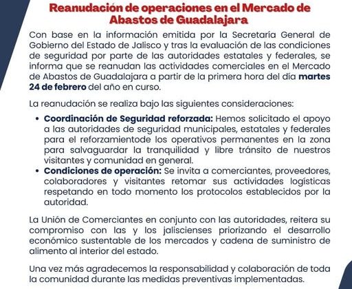 El Mercado de Abastos de Guadalajara informa que este martes 24 de febrero se reanudarán las actividades comerciales tras la información emitida por la Secretaría General de Gobierno del Estado de Jalisco y una evaluación de las condiciones de seguridad realizada en coordinación con autoridades estatales y federales. Reiteramos nuestro compromiso de trabajar para reactivar […]