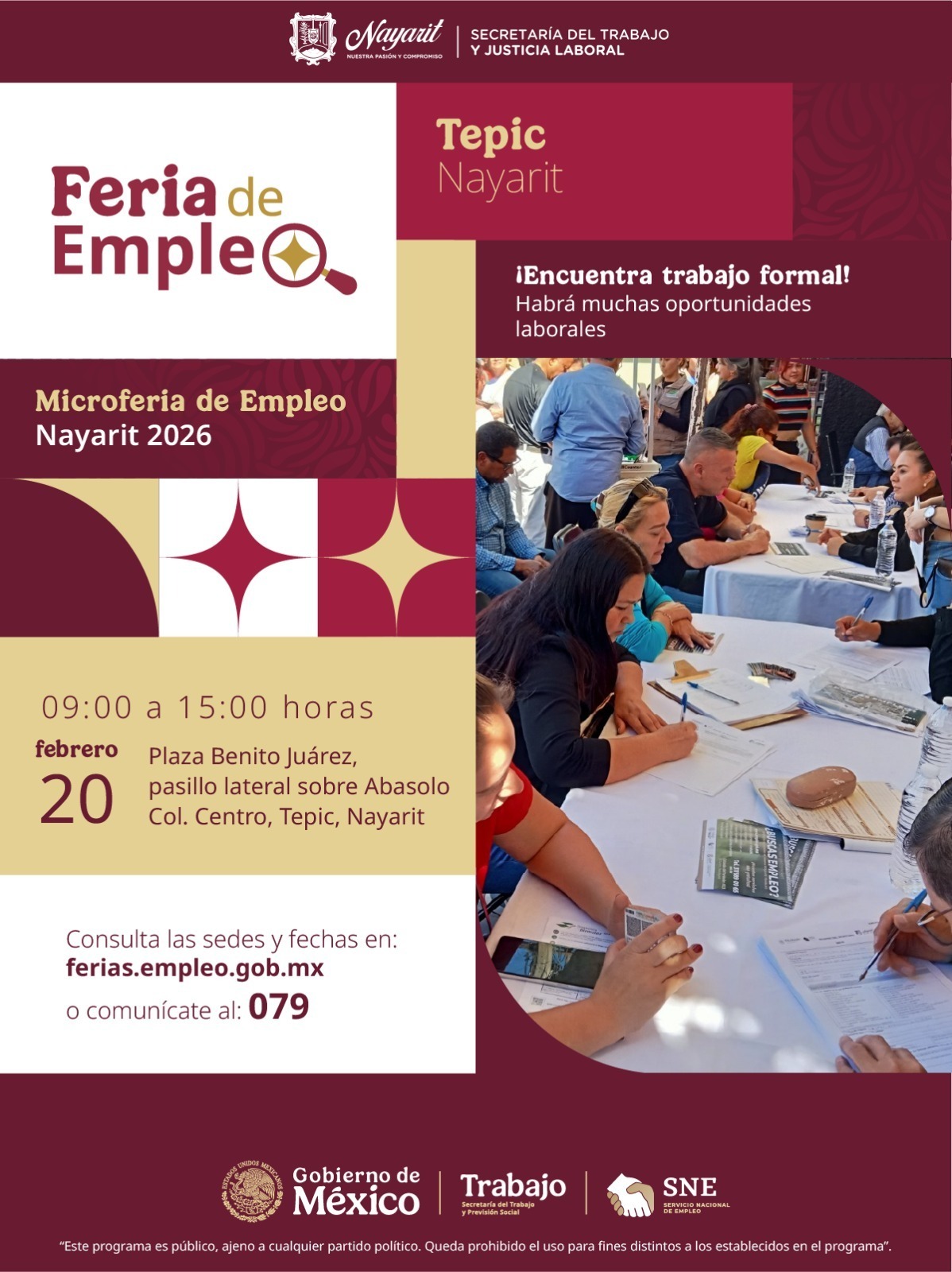 El Gobierno del Estado de Nayarit, en coordinaci贸n con el Gobierno de M茅xico y la Secretar铆a del Trabajo y Justicia Laboral estatal, te invita a aprovechar esta oportunidad laboral.