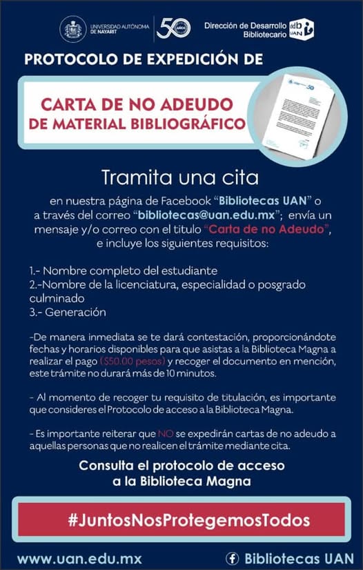Del 6 al 10 de julio, se estarán atendiendo a través de cita a todos los interesados en obtener la Carta de no adeudo de Material Bibliográfico, requisito necesario para la titulación de Nivel Superior de la UAN.