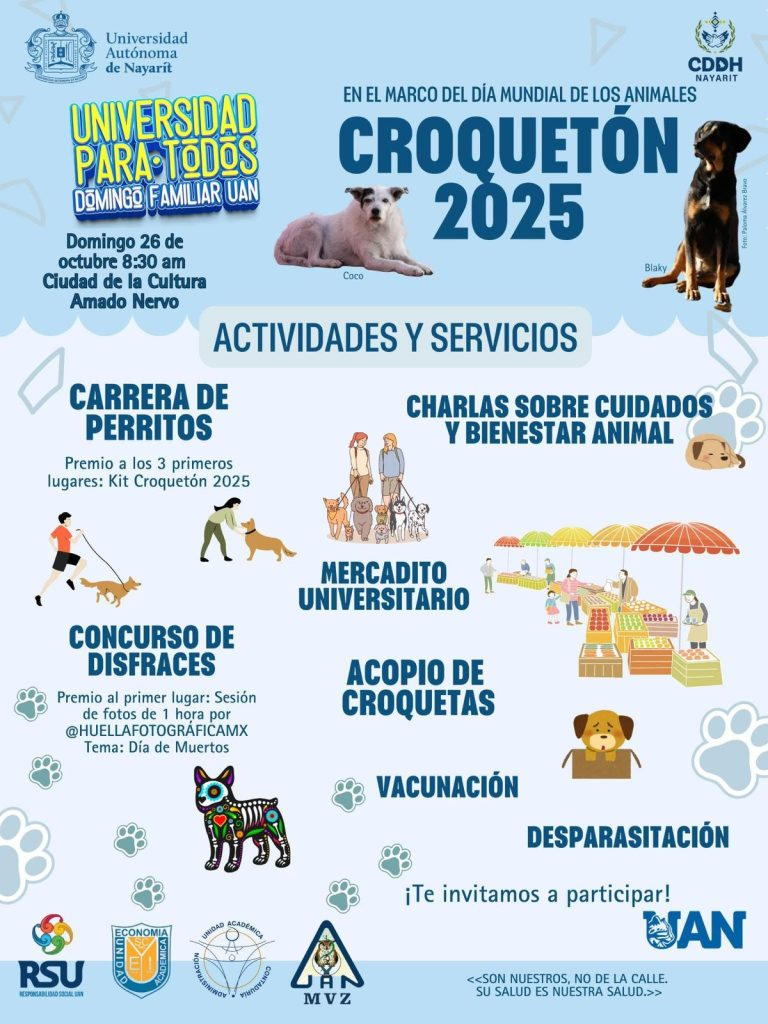 Te compartimos los servicios y actividades del Croquetón 2025, recuerda que este evento se realizará el 📅 domingo 26 de octubre 🕣 a partir de las 8:30 horas en el📍 Campus Ciudad de la Cultura Amado Nervo.