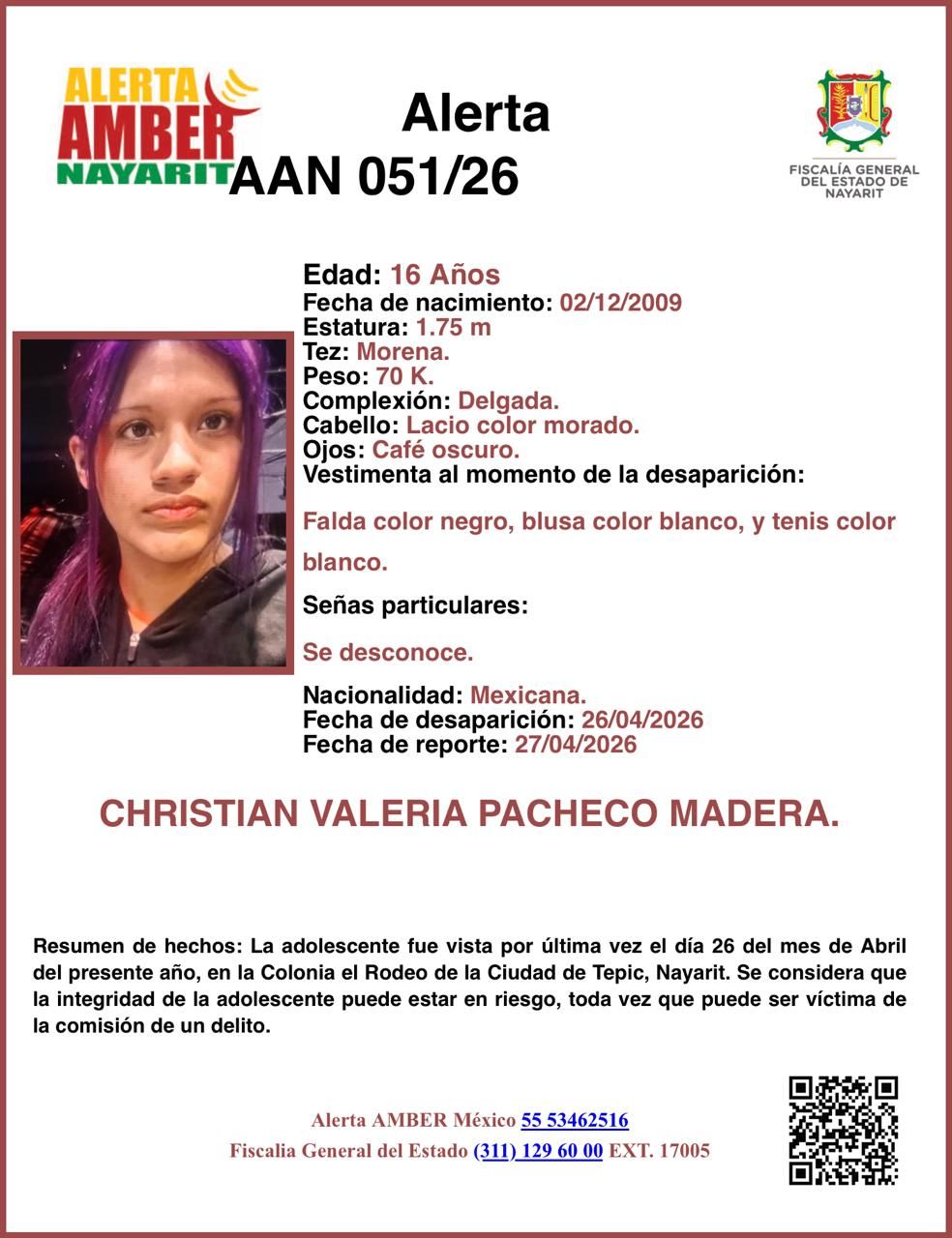 Si tienes información, comunícate a la Coordinación de Alerta Amber Nayarit 311 129 6000 ext. 17005.