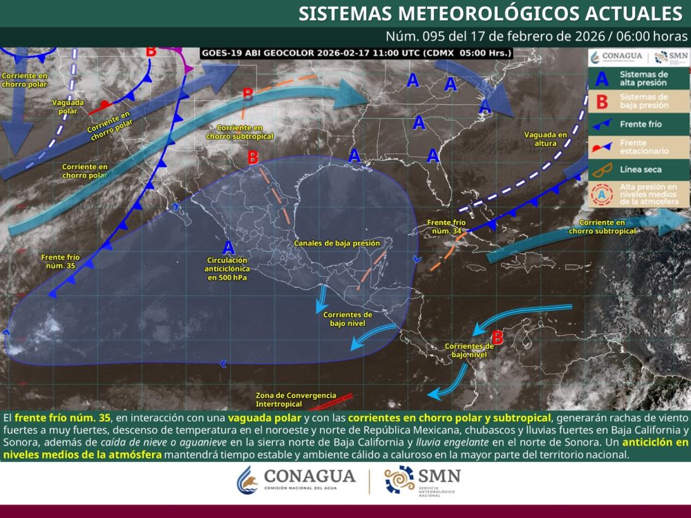 Pacífico Centro: Cielo parcialmente nublado y sin lluvia en la región. Por la mañana, ambiente fresco a templado, con bancos de niebla en zonas de costa. Durante la tarde, ambiente caluroso en la región y muy caluroso en Michoacán. Viento de componente oeste de 20 a 30 km/h con rachas de 40 a 60 km/h en Jalisco (costa), y viento de 10 a 20 km/h en la región, con rachas de 30 a 50 km/h en Michoacán. Oleaje de 1.0 a 2.0 metros de altura en costas de Jalisco y Colima.