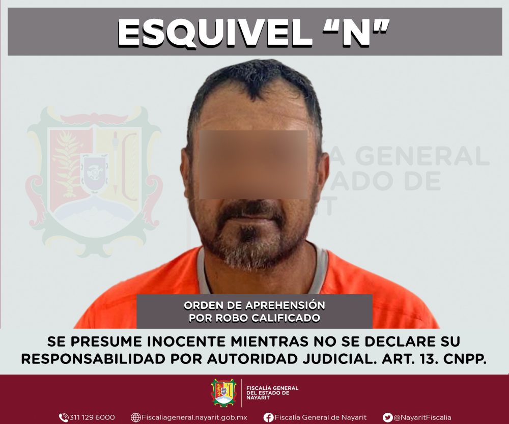 La Fiscalía General de Nayarit a través de la Agencia de Investigación Criminal ejecutó una orden de aprehensión en el municipio de Bahía de Banderas contra Esquivel “N”, por su presumible participación en hechos que para la ley configuran el delito de robo calificado, cometido en perjuicio de una persona de sexo masculino de identidad reservada para salvaguardar su privacidad e integridad.