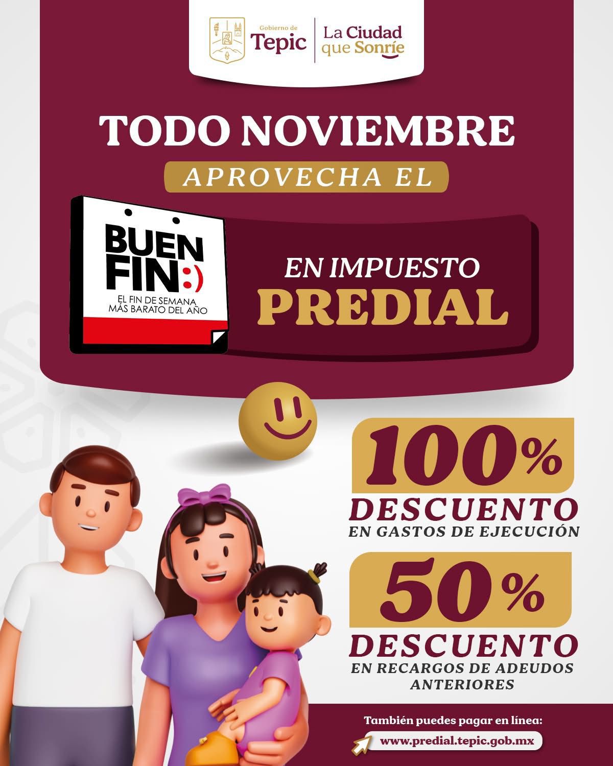 APROVECHA LOS DESCUENTOS DEL BUEN FIN DURANTE TODO NOVIEMBRE para ponerte al corriente con el pago del impuesto predial, 100% de condonación en gastos de ejecución y 50% en recargos de adeudos anteriores, acude a la dirección de Registro Predial, módulos de la Presidencia Municipal y oficinas del SIAPA.