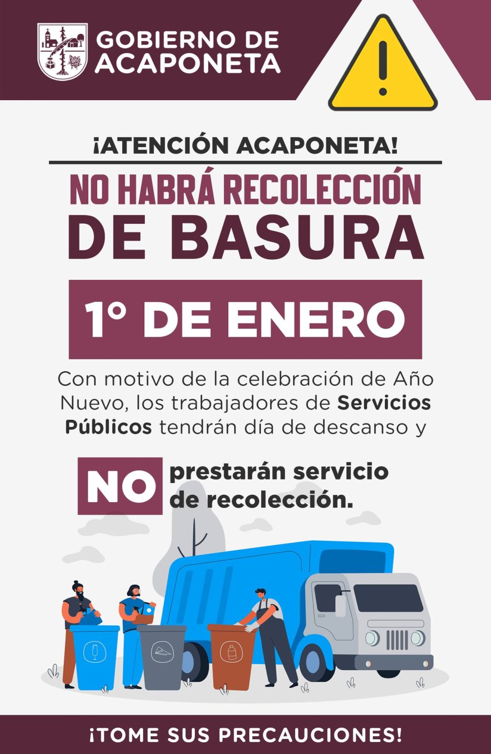 Con motivo de la celebración de Año Nuevo, los trabajadores de Servicios Públicos tendrán día de descanso y NO prestarán servicio de recolección.