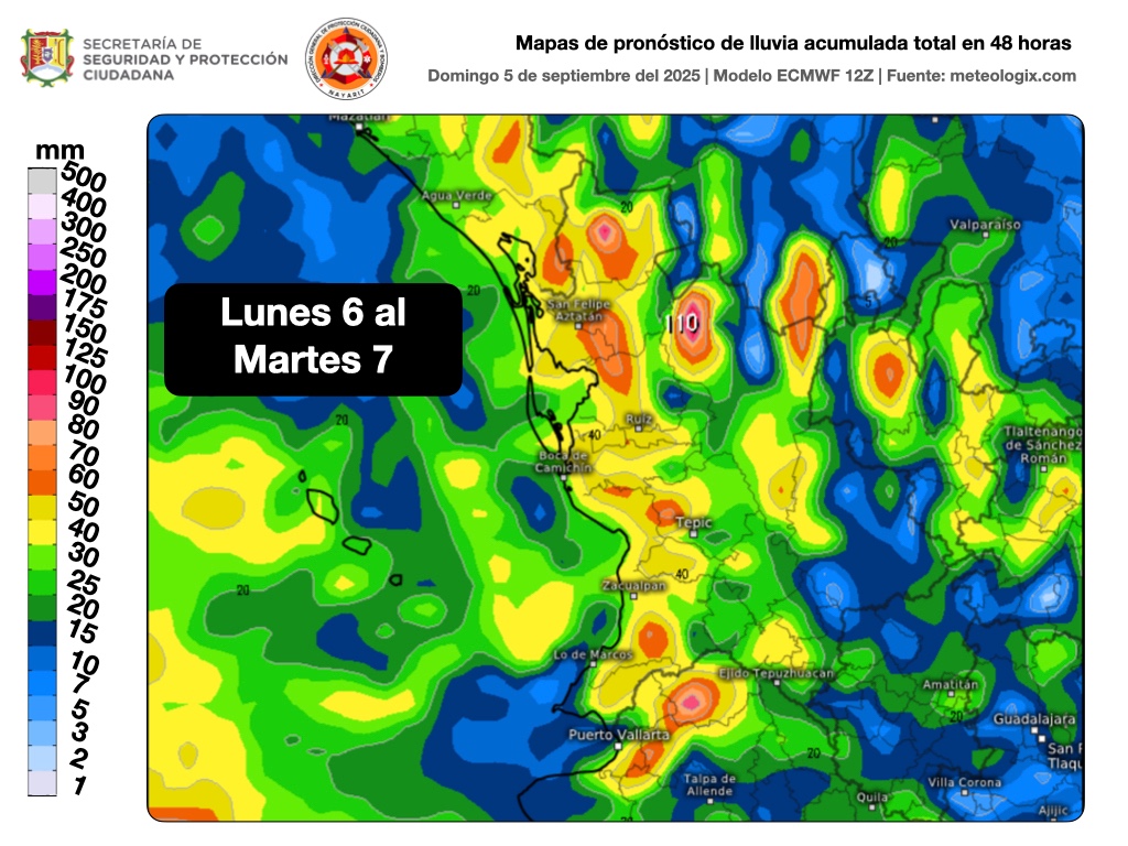 Resumen: Durante esta este lunes a martes se prevén lluvias locales fuertes a muy fuertes (30 a 50 mm) sobre las costas, centro, norte y sierra norte, así como las zonas altas del sur del estado. Así como posibilidad de lluvias locales muy fuertes a intensas (50 a 100 mm) sobre zonas altas de Acaponeta, Huajicori, Del Nayar, San Blas, Compostela y Bahía de Banderas.