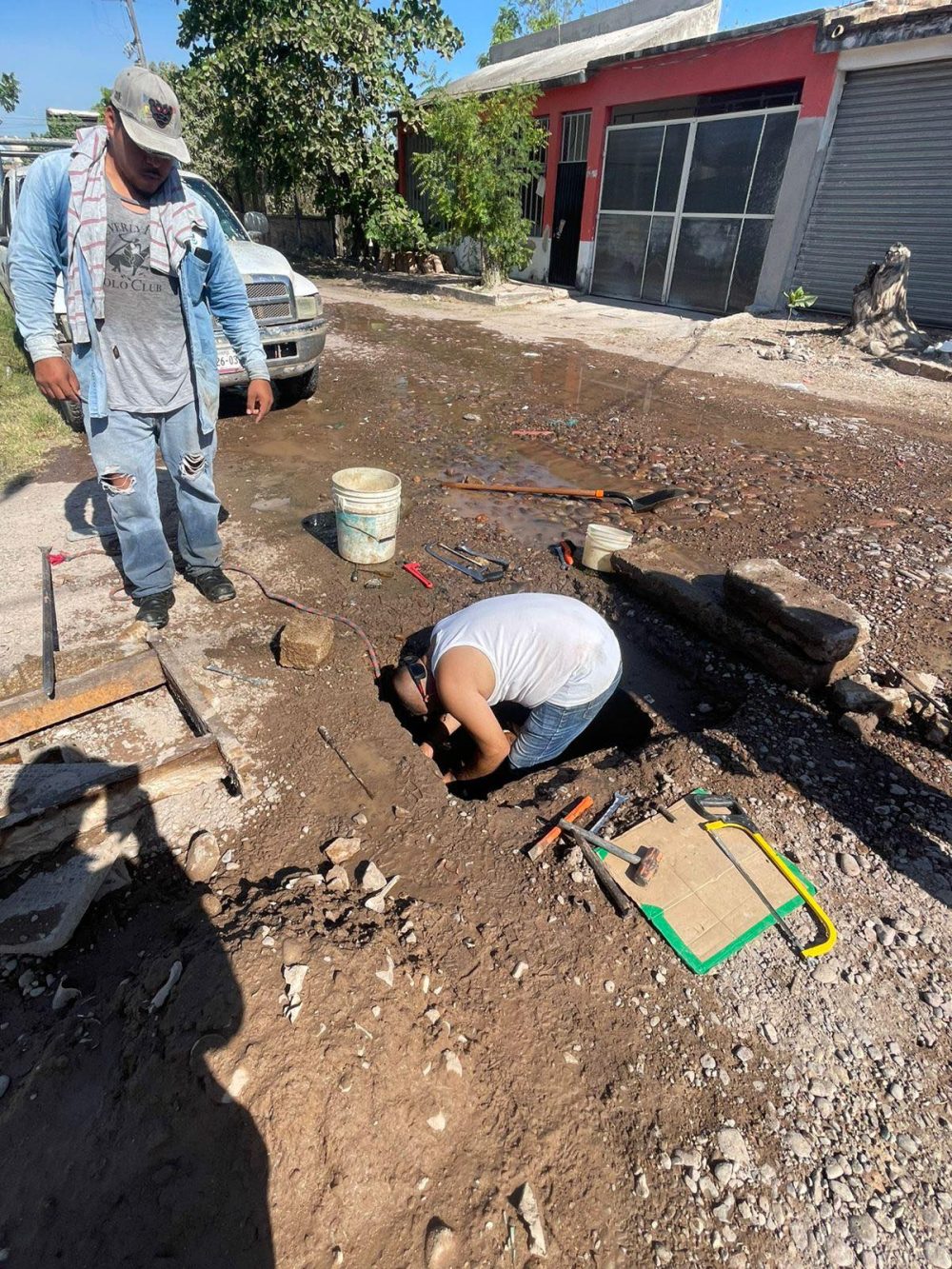 El equipo operativo de Oromapas Acaponeta se encuentra trabajando en la reparación urgente de una fuga localizada en la colonia Las Casitas.