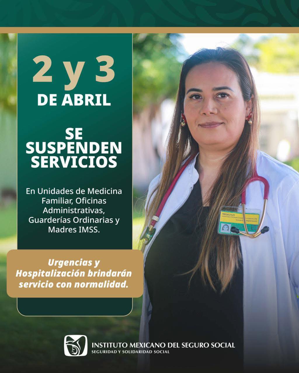 Los días 2 y 3 de abril se suspenden servicios en UMF, oficinas administrativas y guarderías ordinarias.