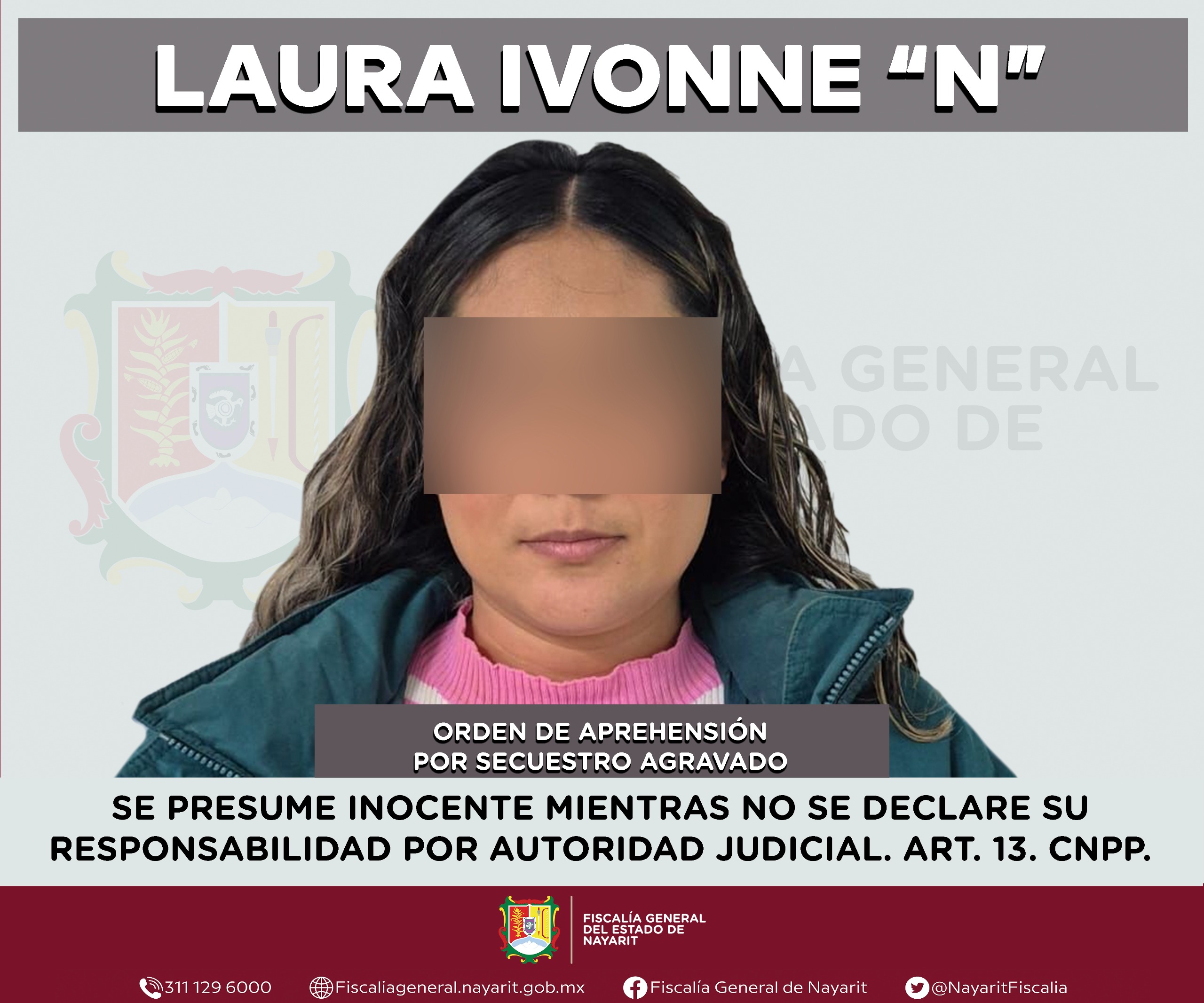 La Fiscalía General de Nayarit a través de la Agencia de Investigación Criminal ejecutó una orden de aprehensión en la ciudad de Tepic contra Laura Ivonne “N”, por su probable participación en hechos que para la ley configuran el delito de secuestro agravado, cometido contra una persona de sexo masculino de la cual se reserva la identidad para salvaguardar su privacidad e integridad.