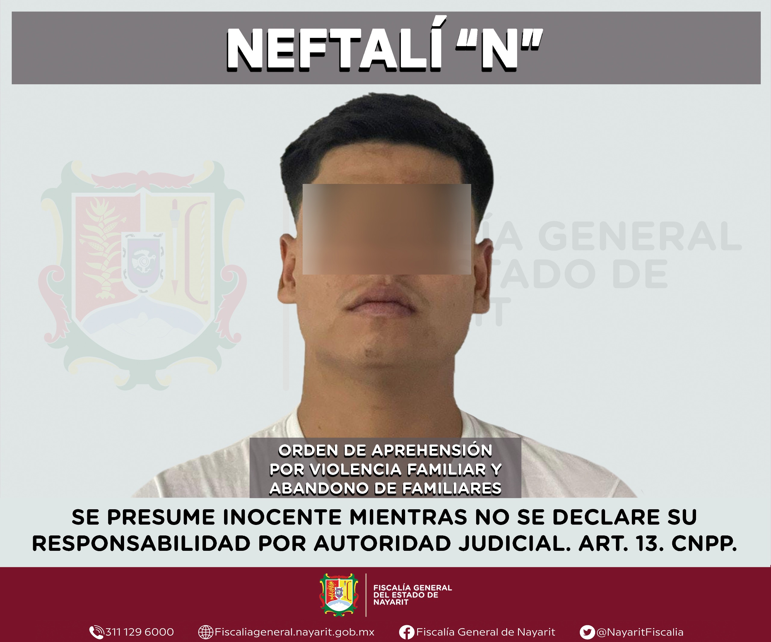 La Fiscalía General del Estado de Nayarit informa que elementos de la Agencia de Investigación Criminal ejecutaron dos órdenes de aprehensión en la ciudad de Tepic contra Neftalí “N”. La primera, por su probable participación en hechos que para la ley configuran el delito de violencia familiar, cometido en agravio de una persona de sexo femenino; y la segunda, por su presunta responsabilidad en el delito de abandono de familiares, cometido en agravio de dos menores de edad. Las identidades de las víctimas se reservan en respeto a su derecho a la privacidad e integridad.