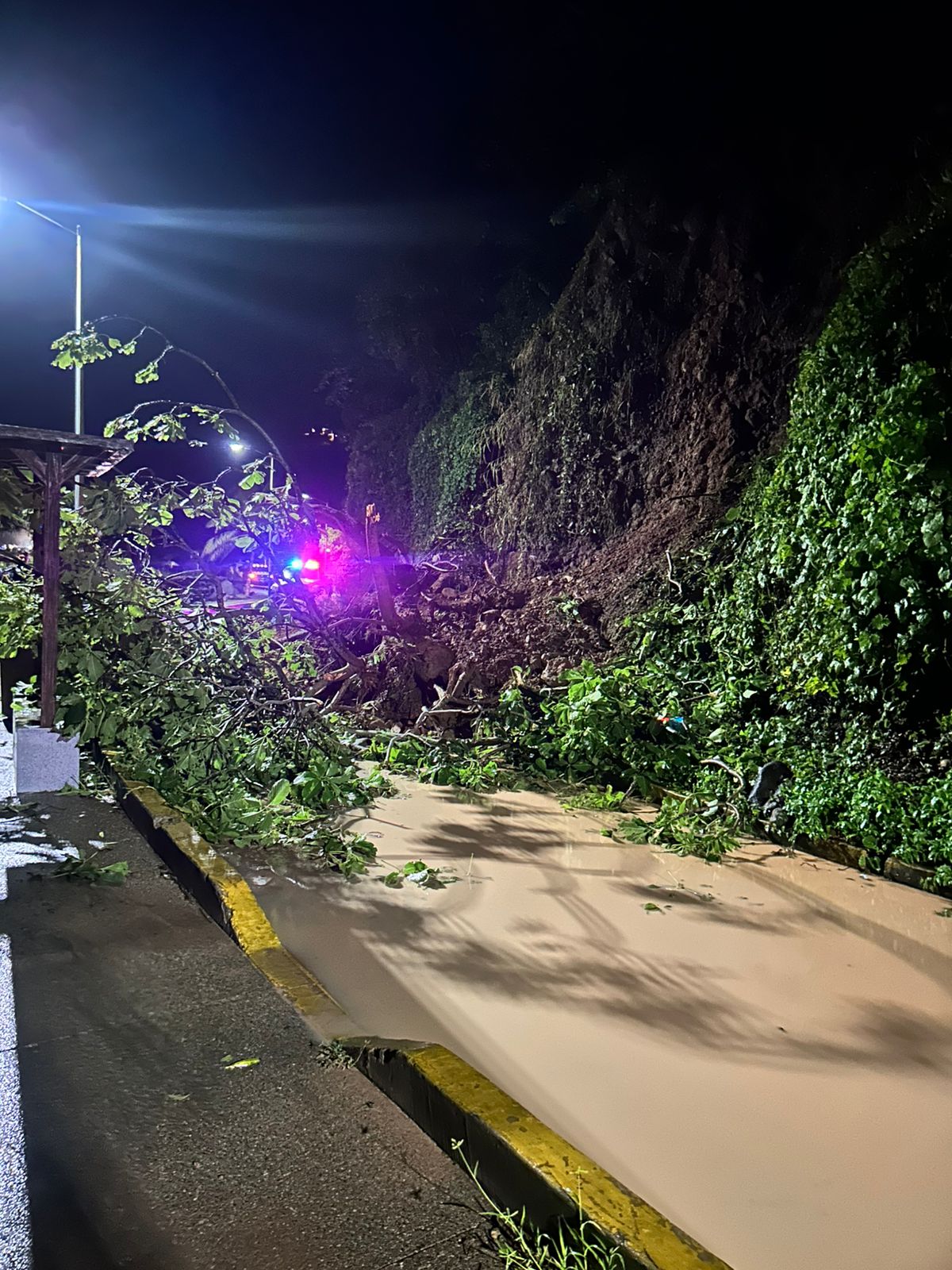 San Blas, Nayarit; 05 de octubre de 2025.- Derivado de las lluvias fuertes a puntuales muy fuertes registradas durante la tarde de este domingo, se generó un deslave en El Paseo de Aticama, ubicado en el municipio de San Blas.