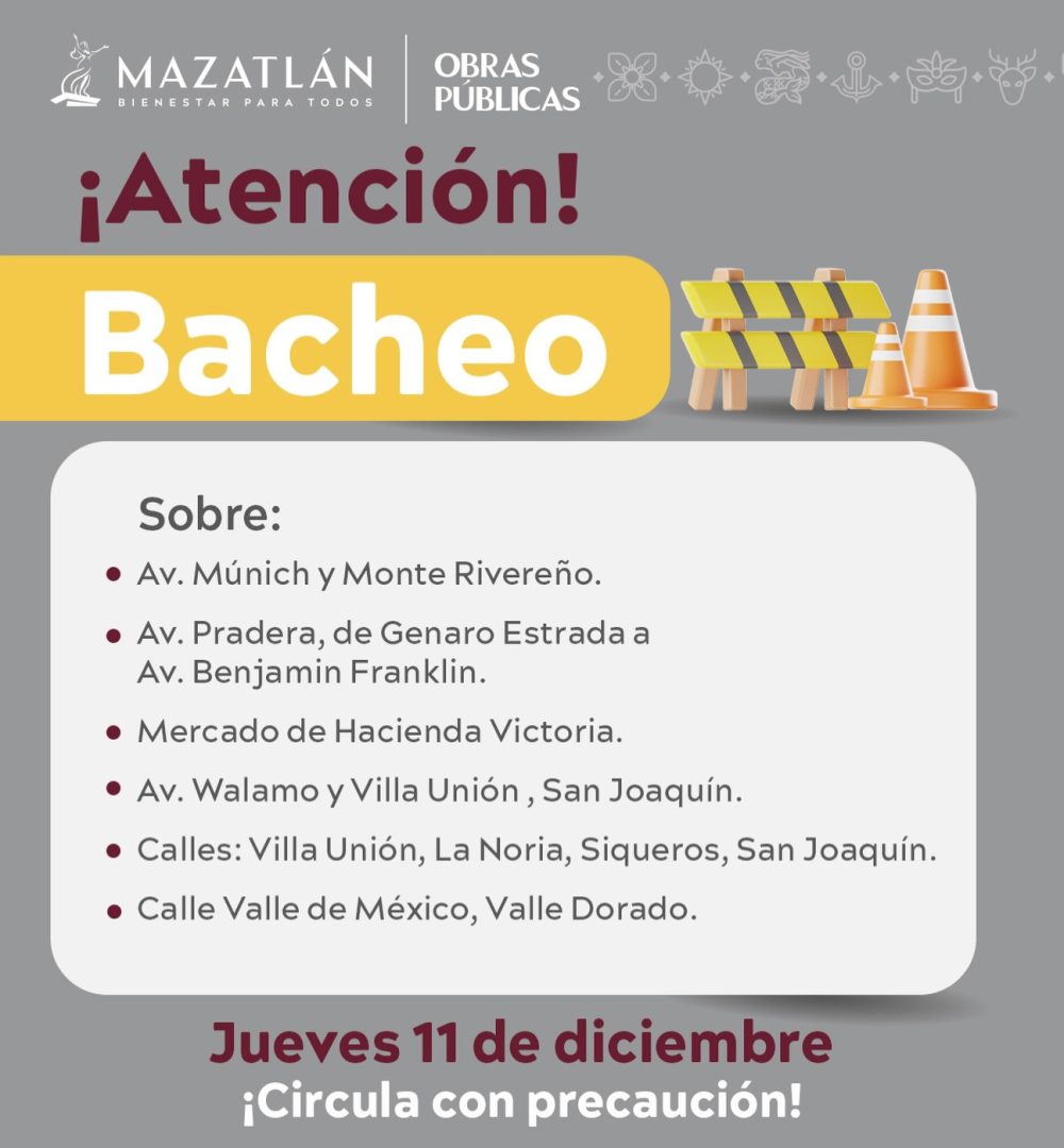 BRIGADAS DE BACHEO ACTIVAS HOY EN LA CIUDAD Nayarit diciembre 11, 2025diciembre 11, 2025RedacciónDeja un comentario en BRIGADAS DE BACHEO ACTIVAS HOY EN LA CIUDAD ¡Atención! Las brigadas de bacheo estarán trabajando hoy en diversos puntos de la ciudad para mejorar la movilidad y seguridad vial. Jueves 11 de diciembre. ¡Circula con precaución!