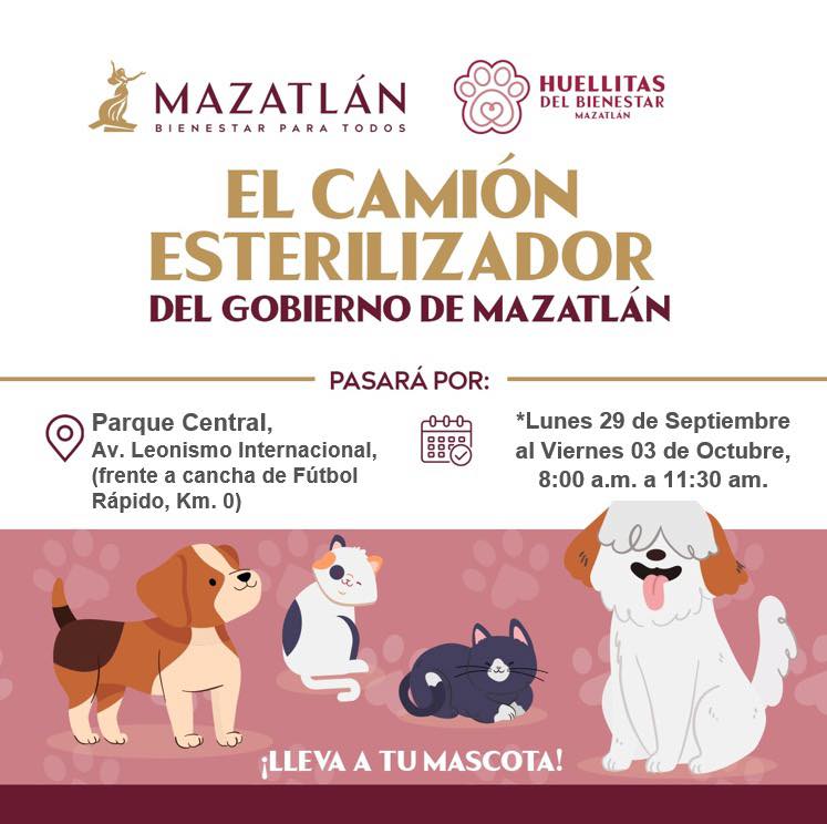 El Camión Esterilizador del Gobierno Municipal estará en el Parque Central (Av. Leonismo Internacional, frente a la cancha de fútbol rápido, Km. 0) del Lunes 29 de Septiembre al Viernes 03 de Octubre, de 8:00 a.m. a 11:30 a.m.