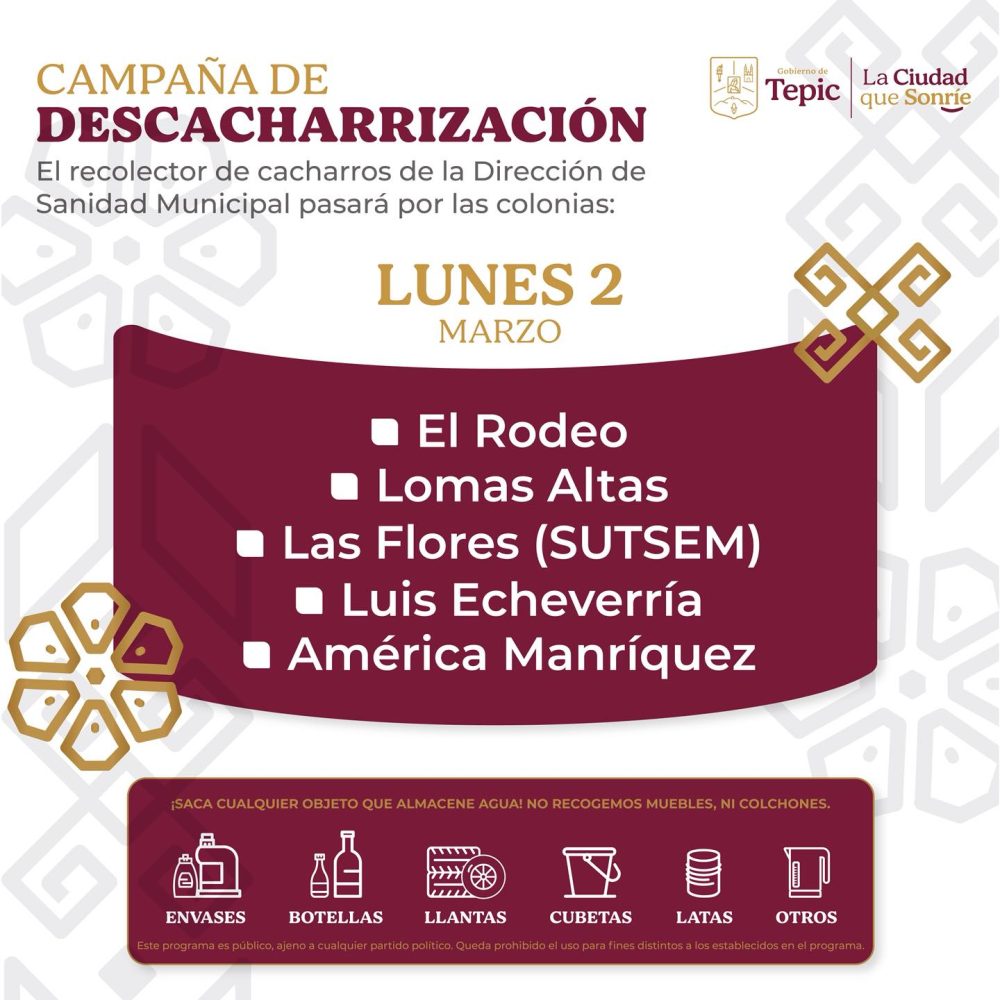 Del 2 al 6 de marzo, la campaña de Descacharrización recorrerá colonias de Tepic como parte de las acciones de prevención contra criaderos de mosquitos. 🦟🚫