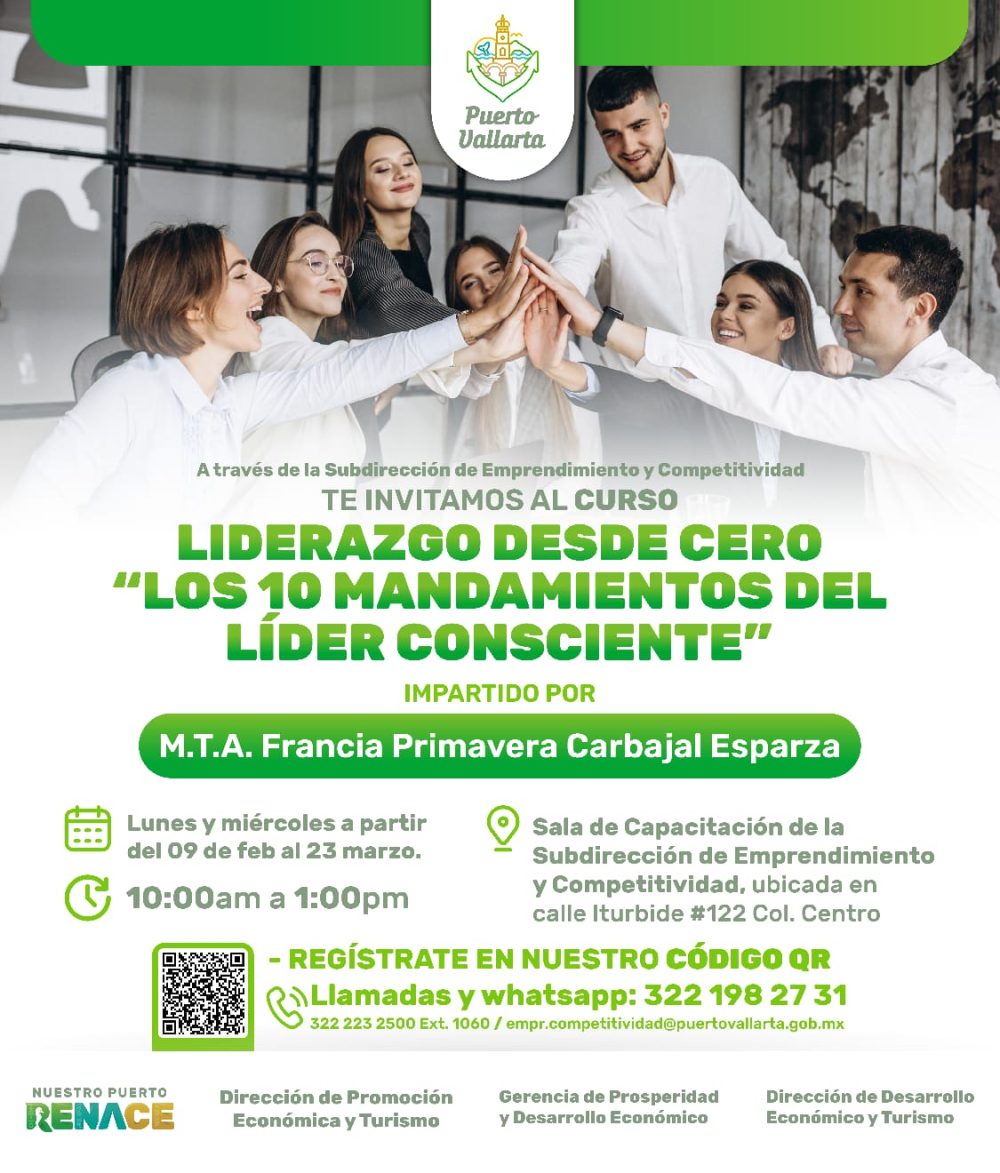 Puerto Vallarta abre nuevas oportunidades de crecimiento personal y profesional con el curso “Liderazgo desde Cero: Los 10 Mandamientos del Líder Consciente”, una iniciativa del gobierno que encabeza el Arquitecto Luis Ernesto Munguía González, a través de la Dirección de Promoción Económica y Turismo, dirigida a quienes buscan fortalecer sus habilidades de liderazgo y potenciar su desarrollo.