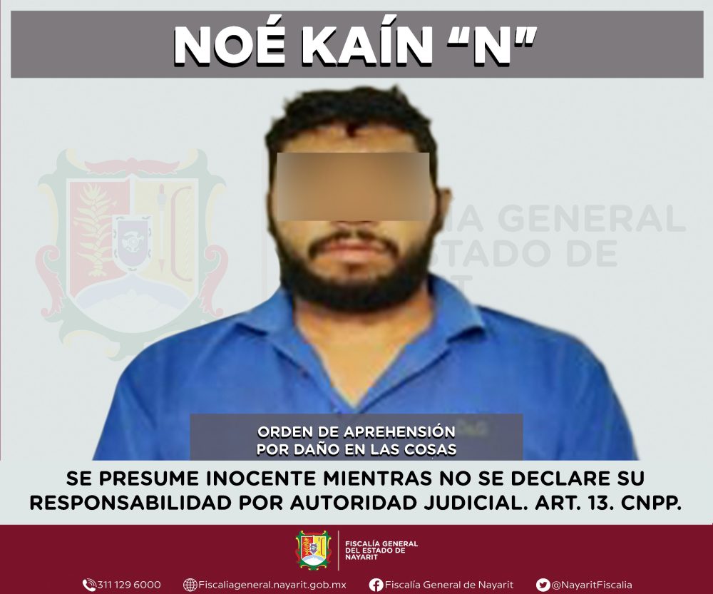 La Fiscalía General de Nayarit a través de la Agencia de Investigación Criminal ejecutó una orden de aprehensión en el municipio de Tecuala contra Noé Kaín “N”, por su probable participación en hechos que para la ley configuran el delito de daño en las cosas, en agravio de una persona de sexo masculino cuya identidad se reserva para proteger su privacidad e integridad.