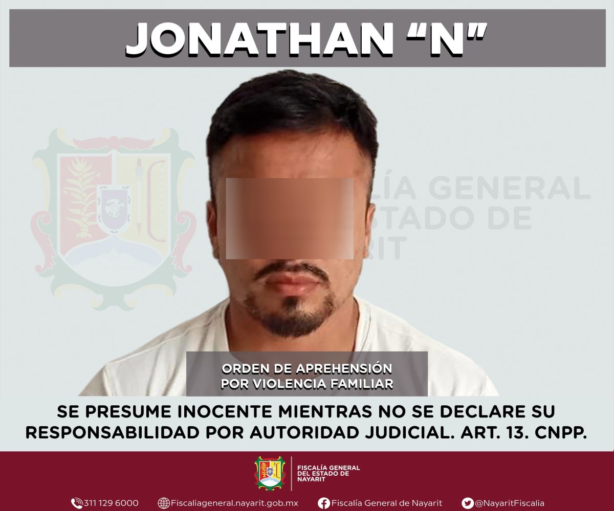 La Fiscalía General del estado de Nayarit informa que elementos de la Agencia de Investigación Criminal ejecutaron una orden de aprehensión en la ciudad de Tepic contra Jonathan “N”, la primera por su probable participación en hechos que la legislación vigente tipifica como delito de violencia familiar, siendo la víctima una mujer cuya identidad se mantiene bajo reserva por respeto a su derecho a la privacidad e integridad.