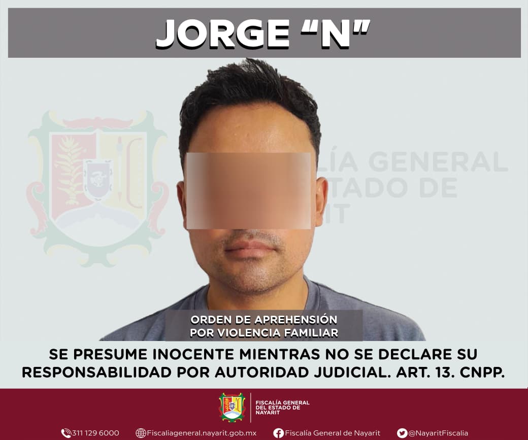 La Fiscalía General del estado de Nayarit informa que elementos de la Agencia de Investigación Criminal ejecutaron una orden de aprehensión en la ciudad de Tepic contra Jorge “N”, por su probable participación en hechos que la legislación vigente tipifica como delito de violencia familiar, cometido en agravio de una mujer cuya identidad se reserva por respeto a su derecho a la privacidad e integridad.