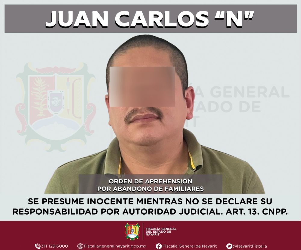 La Fiscalía General del estado de Nayarit informa que elementos de la Agencia de Investigación Criminal ejecutaron una orden de aprehensión en la ciudad de Tepic contra Juan Carlos “N”, por su probable participación en hechos que la ley tipifica como delito de abandono de familiares, cometido contra una persona menor de edad cuya identidad se reserva con el propósito de salvaguardar su privacidad e integridad.