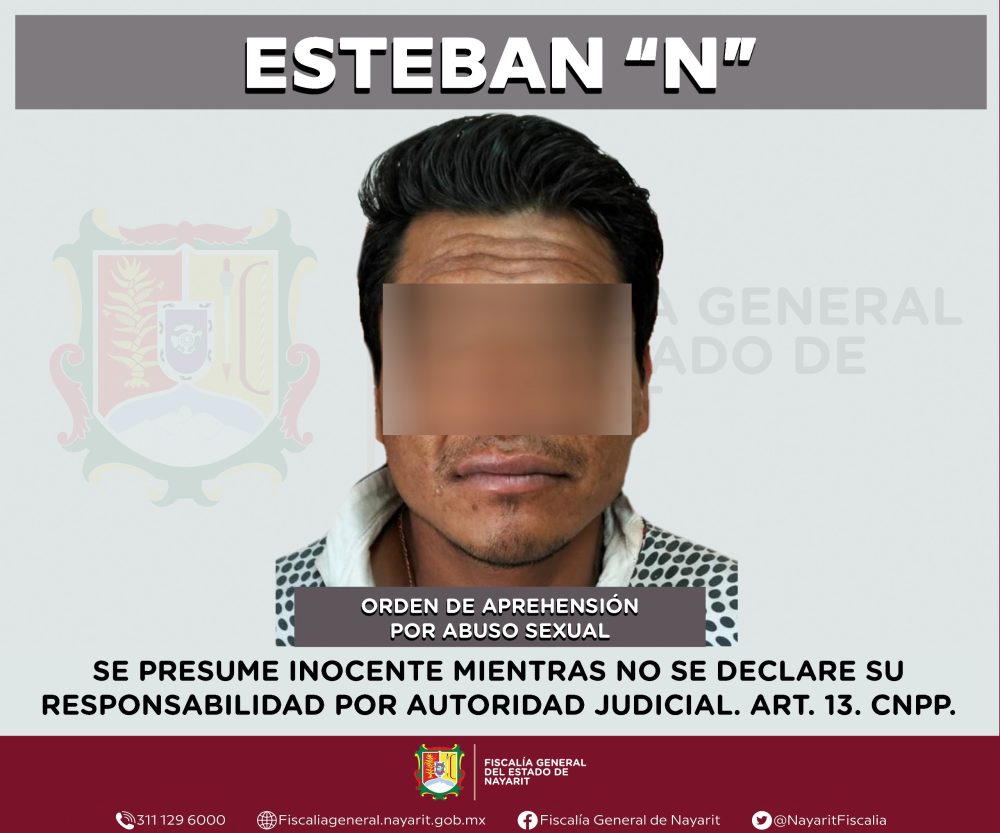 La Fiscalía General de Nayarit informa que a través de la Agencia de Investigación Criminal ejecutó una orden de aprehensión en la localidad Francisco I. Madero -Puga- municipio de Tepic contra Esteban “N”, por su presunta participación en hechos que la ley tipifica como delito de abuso sexual, cometido contra una persona de sexo femenino de quien se reserva la identidad para salvaguardar su privacidad e integridad.