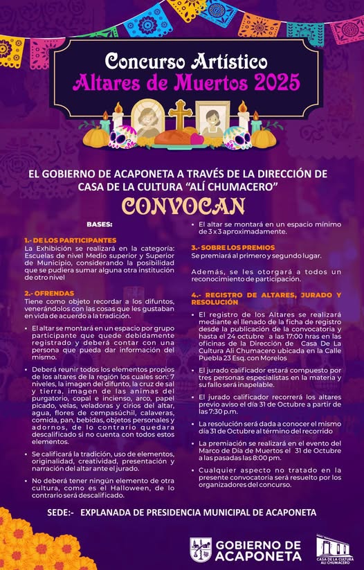 Casa de la Cultura Alรญ Chumacero te invita a participar en el ๐—–๐—ผ๐—ป๐—ฐ๐˜‚๐—ฟ๐˜€๐—ผ ๐—”๐—ฟ๐˜๐—ถฬ๐˜€๐˜๐—ถ๐—ฐ๐—ผ ๐—ฑ๐—ฒ ๐—”๐—น๐˜๐—ฎ๐—ฟ๐—ฒ๐˜€ ๐—ฑ๐—ฒ ๐— ๐˜‚๐—ฒ๐—ฟ๐˜๐—ผ๐˜€ ๐Ÿฎ๐Ÿฌ๐Ÿฎ๐Ÿฑ