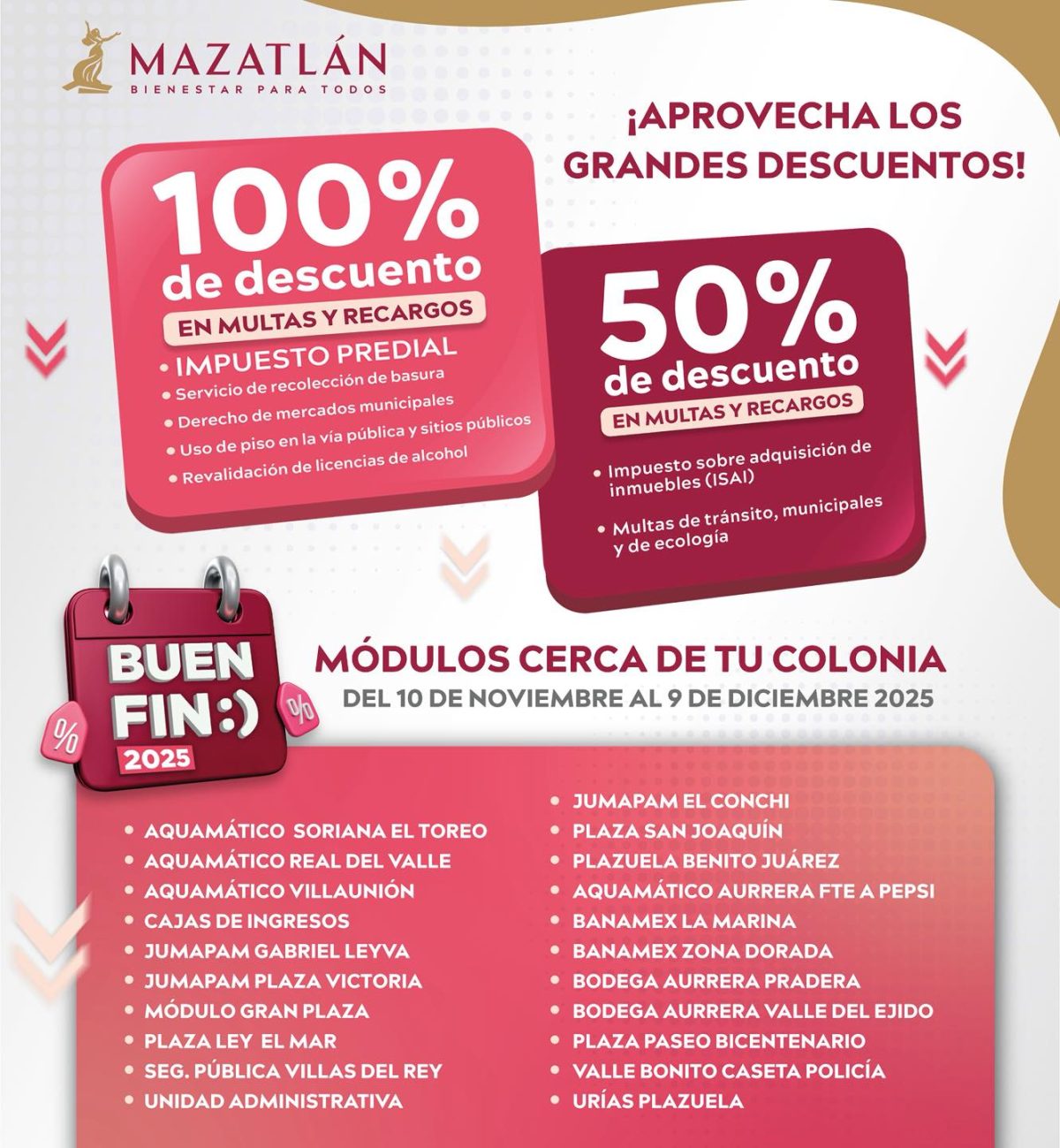 ¡Aprovecha el BUEN FIN Mazatlán 2025! Del 10 de noviembre al 9 de diciembre, disfruta: 100% de descuento en multas y recargos de predial, basura, mercados y licencias. 50% de descuento en multas de tránsito y adquisición de inmuebles. Acude al módulo más cercano y ponte al día. ¡Mazatlán te premia por cumplir!