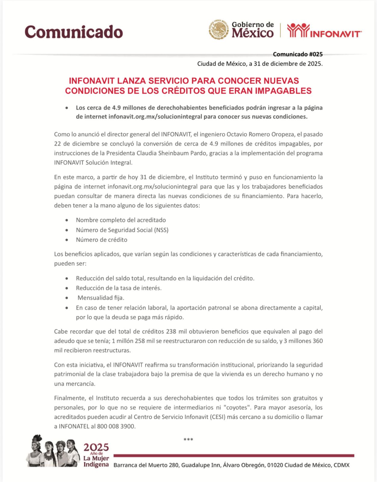 Como lo anunció el director general del INFONAVIT, el ingeniero Octavio Romero Oropeza, el pasado 22 de diciembre se concluyó la conversión de cerca de 4.9 millones de créditos impagables, por instrucciones de la Presidenta Claudia Sheinbaum Pardo, gracias a la implementación del programa INFONAVIT Solución Integral. En este marco, a partir de hoy 31 […]