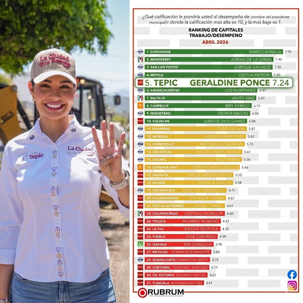 Tepic.– Los apoyos a mujeres jefas de familia y a emprendedores, así como la mejora en servicios públicos como la recolección de basura y el alumbrado, han posicionado a Geraldine Ponce como la quinta alcaldesa mejor evaluada entre presidentes y presidentas municipales de las 31 capitales del país.