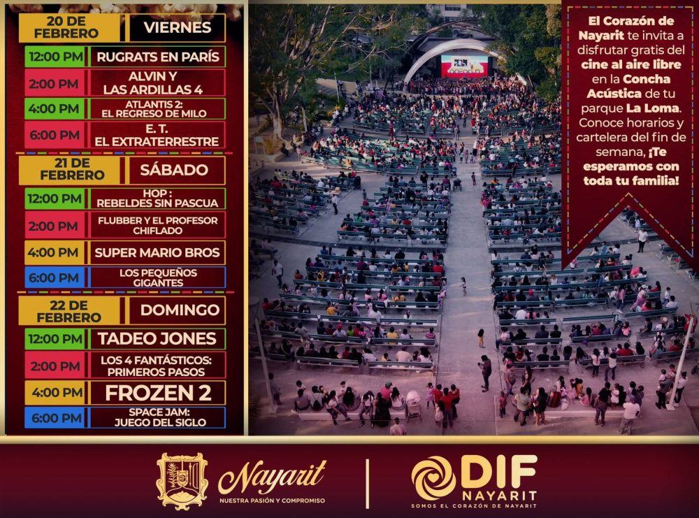 Este fin de semana, la doctora Beatriz Estrada Martínez y el Corazón de Nayarit te invitan a ti y a tu familia y amigos a disfrutar de un momento lleno de entretenimiento y mucha diversión 🥳 en el cine al aire libre de la Concha Acústica del Parque La Loma. 🏞️