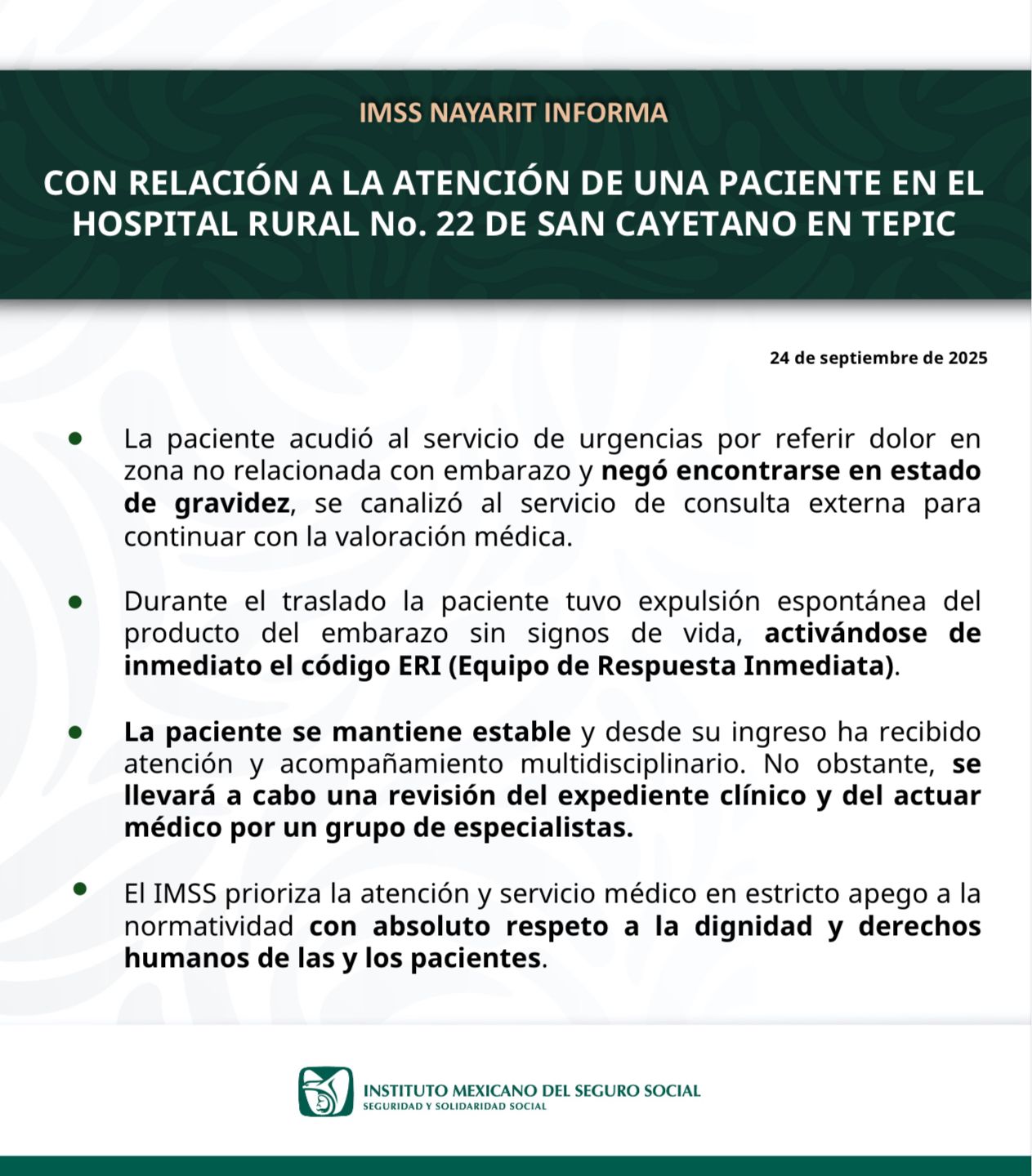 Con relación a la atención de una paciente en el Hospital Rural No. 22 de San Cayetano en Tepic, la Representación del IMSS en Nayarit informa: