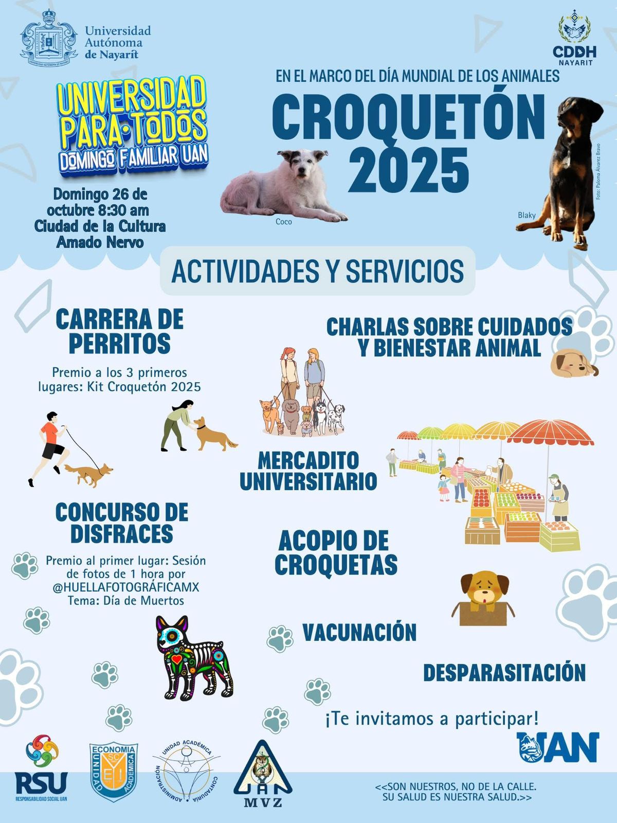 Te compartimos los servicios y actividades del Croquetón 2025, recuerda que este evento se realizará el 📅 domingo 26 de octubre 🕣 a partir de las 8:30 horas en el📍 Campus Ciudad de la Cultura Amado Nervo.