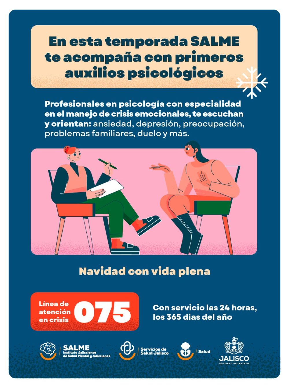 A trav茅s de SALME y el OPD Servicios de Salud Jalisco, mantenemos guardias en los centros de salud durante toda la 茅poca decembrina y atenci贸n las 24 horas, los 365 d铆as del a帽o, en la L铆nea de Atenci贸n en Crisis 075 y la L铆nea de Salud.
