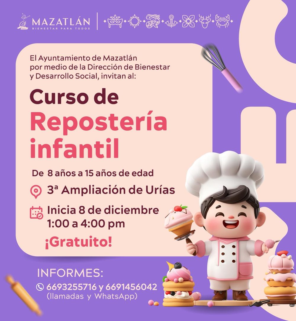 CURSO DE REPOSTERÍA INFANTIL EN MAZATLÁN Mazatlán diciembre 6, 2025diciembre 6, 2025RedacciónDeja un comentario en CURSO DE REPOSTERÍA INFANTIL EN MAZATLÁN El Ayuntamiento de Mazatlán, a través de la Dirección de Bienestar y Desarrollo Social, te invita al: Curso de Repostería Infantil Para niñas y niños de 8 a 15 años 3ª Ampliación de Urías Inicia el 8 de diciembre De 1:00 a 4:00 pm ¡Totalmente gratuito!