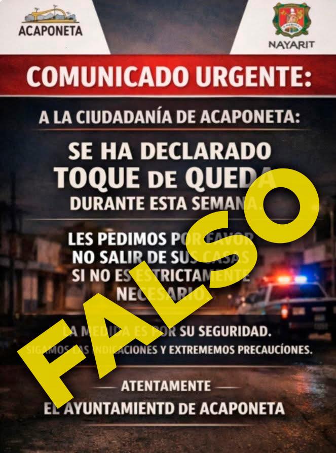 La Dirección de Seguridad Pública del Gobierno De Acaponeta informa a la ciudadanía que el comunicado que circula sobre un supuesto «Toque de Queda» en nuestro municipio es TOTALMENTE FALSO.