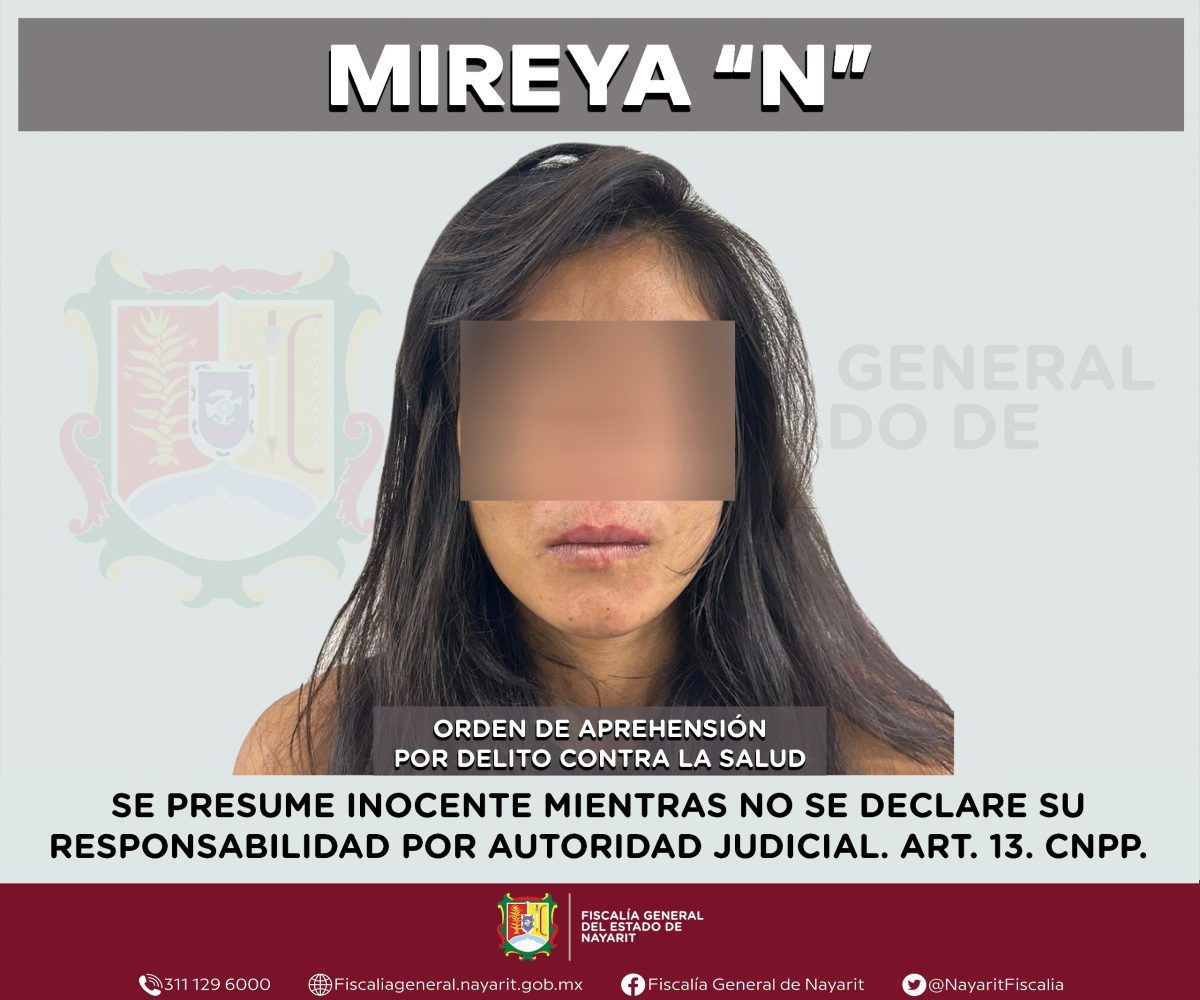 La Fiscalía General del estado de Nayarit informa que elementos de la Agencia de Investigación Criminal ejecutaron una orden de aprehensión en la ciudad de Tepic contra Mireya “N”, por su probable participación en hechos que la legislación vigente tipifica como delito contra la salud en su modalidad de narcomenudeo -en su hipótesis de posesión de psicotrópicos-, cometido en agravio de la sociedad.