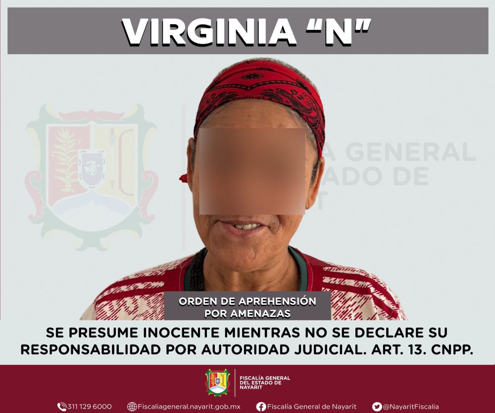Elementos de la Agencia de Investigación Criminal de Nayarit ejecutaron una orden de aprehensión en la localidad El Ahualamo, municipio de Santa María del Oro contra Virginia “N”, por su probable participación en hechos que para la ley configuran el delito de amenazas, cometido contra una persona de sexo masculino de la cual se reserva la identidad para salvaguardar su privacidad e integridad.