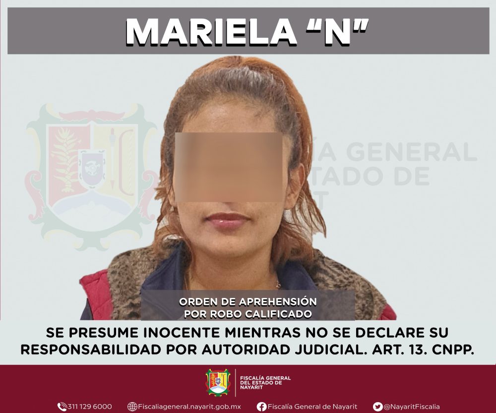 Elementos de la Agencia de Investigación Criminal de Nayarit ejecutaron una orden de aprehensión en la ciudad de Tepic contra Mariela “N”, por su probable participación en hechos que para la ley configuran el delito de robo calificado, cometido en agravio de dos personas de sexo masculino cuyas identidades se reservan para proteger su privacidad e integridad.