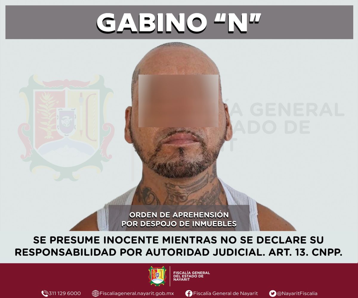 La Fiscalía General del estado de Nayarit informa que elementos de la Agencia de Investigación Criminal ejecutaron una orden de aprehensión en la localidad San Juan de Abajo, municipio de Bahía de Banderas contra Gabino “N”, por su probable participación en hechos que la ley tipifica como delito de despojo de inmuebles.