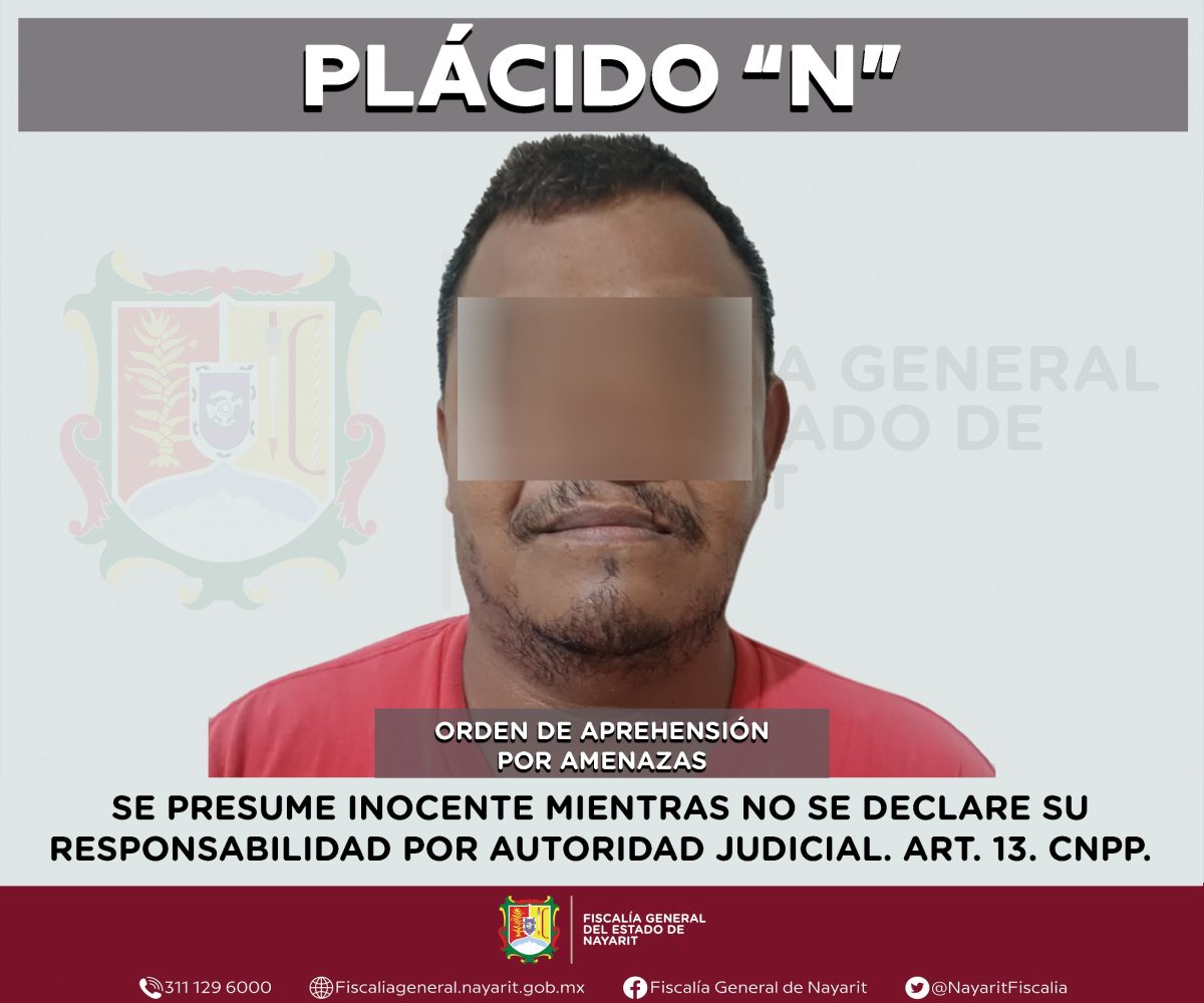 La Fiscalía General del estado de Nayarit informa que elementos de la Agencia de Investigación Criminal ejecutaron una orden de aprehensión en el municipio de Tuxpan contra Plácido “N”, por su probable participación en hechos que la legislación vigente tipifica como delito de amenazas, cometido en agravio de una persona de sexo masculino de quien se reserva la identidad respetando su derecho a la privacidad e integridad.