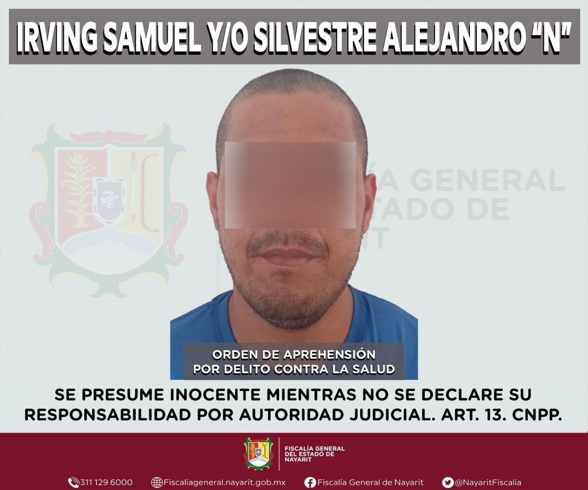 La Fiscalía General del estado de Nayarit informa que elementos de la Agencia de Investigación Criminal ejecutaron una orden de aprehensión en la capital nayarita contra Irving Samuel y/o Silvestre Alejandro “N”, por su probable participación en hechos que la ley tipifica como delito contra la salud en su modalidad de narcomenudeo -en su hipótesis de posesión de psicotrópicos-, cometido en agravio de la sociedad.
