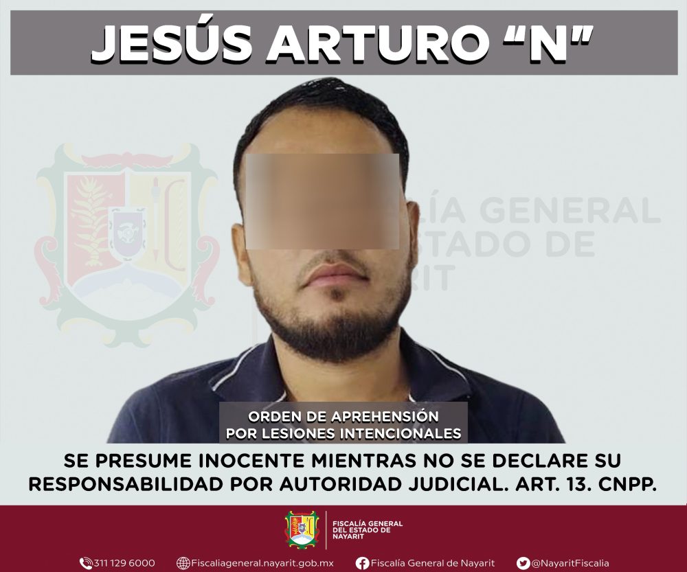La Fiscalía General del estado de Nayarit informa que elementos de la Agencia de Investigación Criminal ejecutaron una orden de aprehensión contra Jesús Arturo “N”, por su probable participación en hechos que la ley tipifica como delito de lesiones intencionales, cometido en agravio de una persona de sexo femenino cuya identidad se reserva por respeto a su derecho a la privacidad e integridad.