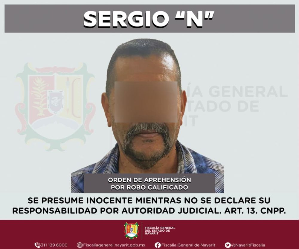 Elementos de la Agencia de Investigación Criminal de Nayarit ejecutaron una orden de aprehensión en la ciudad de Tepic contra Sergio “N”, por su presumible participación en hechos que para la ley configuran el delito de robo calificado, cometido en agravio de tres personas -dos de sexo femenino y otra de sexo masculino-. Las identidades de las víctimas se mantienen bajo reserva para salvaguardar su privacidad e integridad.