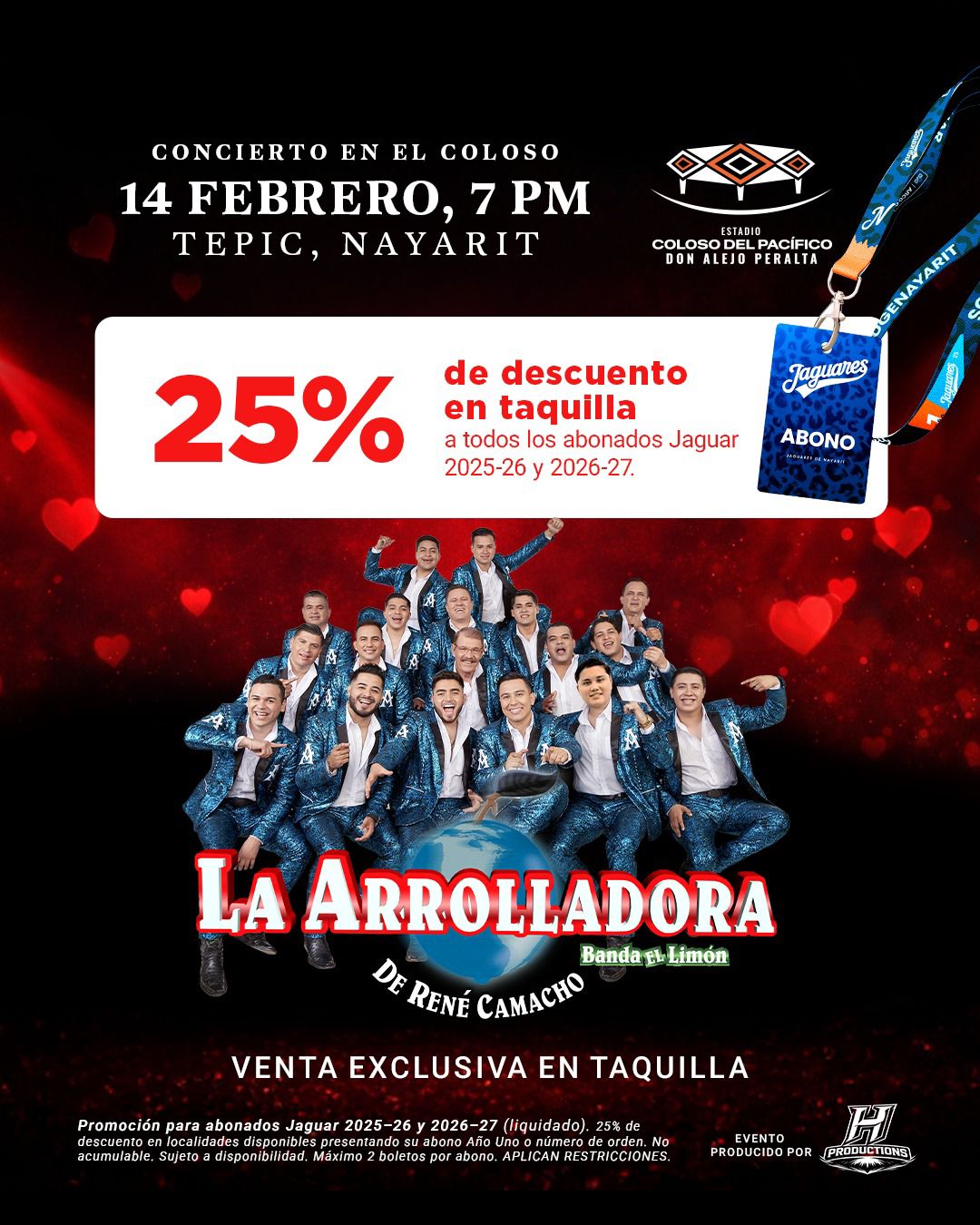 La Arrolladora Banda El Limón de René Camacho llegará al Coloso del Pacífico este 14 de febrero a las 7:00 PM, para una noche llena de éxitos, nostalgia y fiesta.