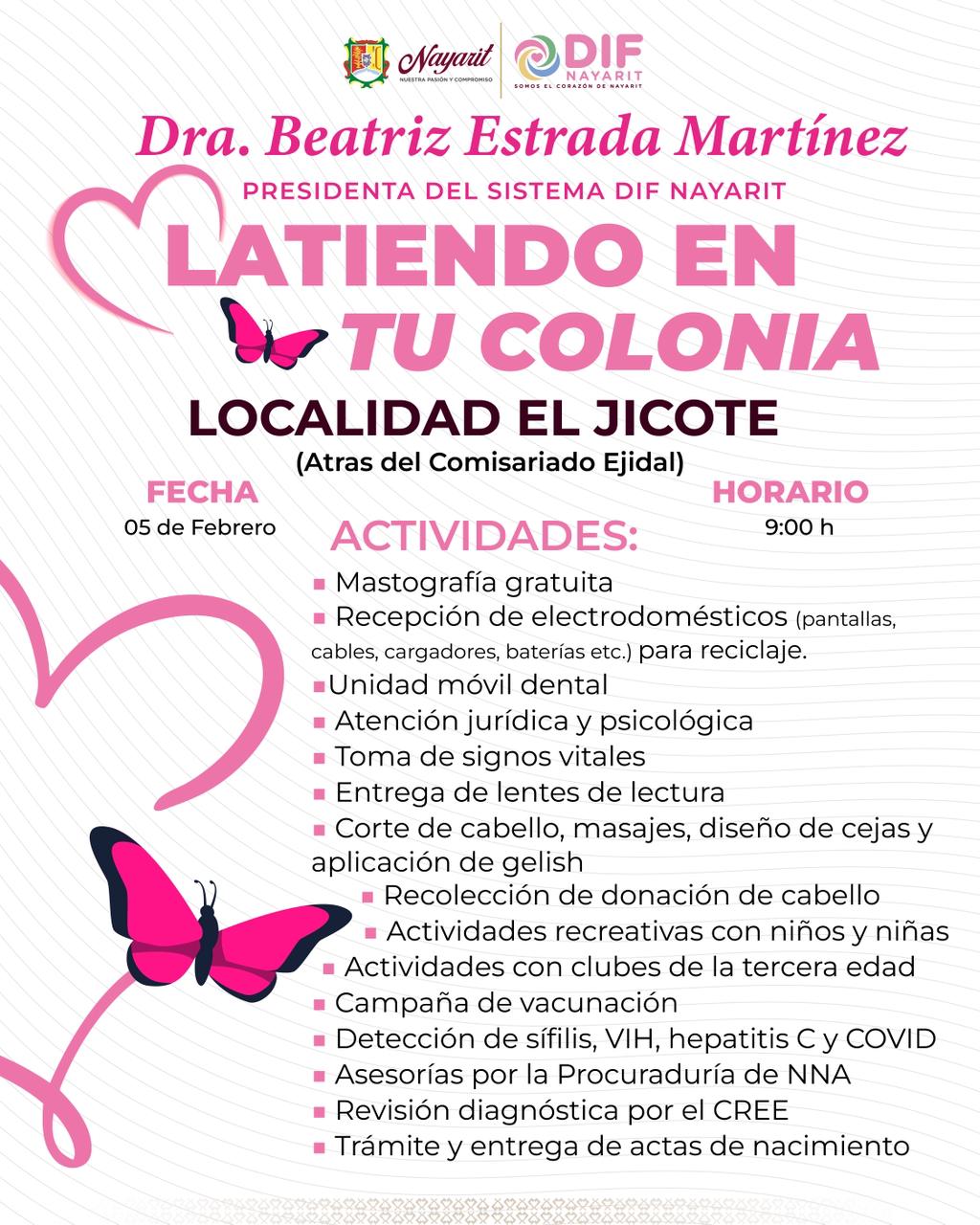 El 5 de febrero, a las 9:00 de la mañana, esta jornada llegará a la localidad El Jicote, atrás del Comisariado Ejidal, llevando servicios gratuitos como mastografía, unidad móvil dental, atención jurídica y psicológica, toma de signos vitales, entrega de lentes de lectura, actividades para niñas, niños y personas adultas mayores, así como campaña de vacunación y otros apoyos.