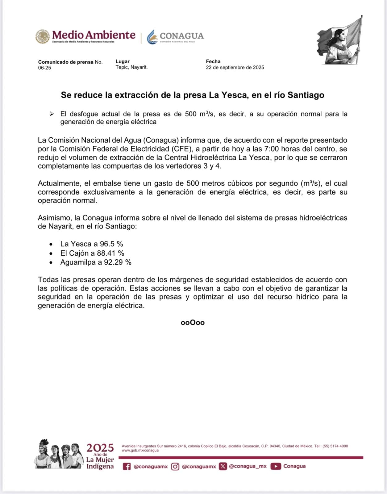 De acuerdo con la Comisión Nacional del Agua (Conagua) y la Secretaría de Medio Ambiente y Recursos Naturales, se redujo el volumen de extracción de la Central Hidroeléctrica La Yesca, ubicada en el río Santiago.