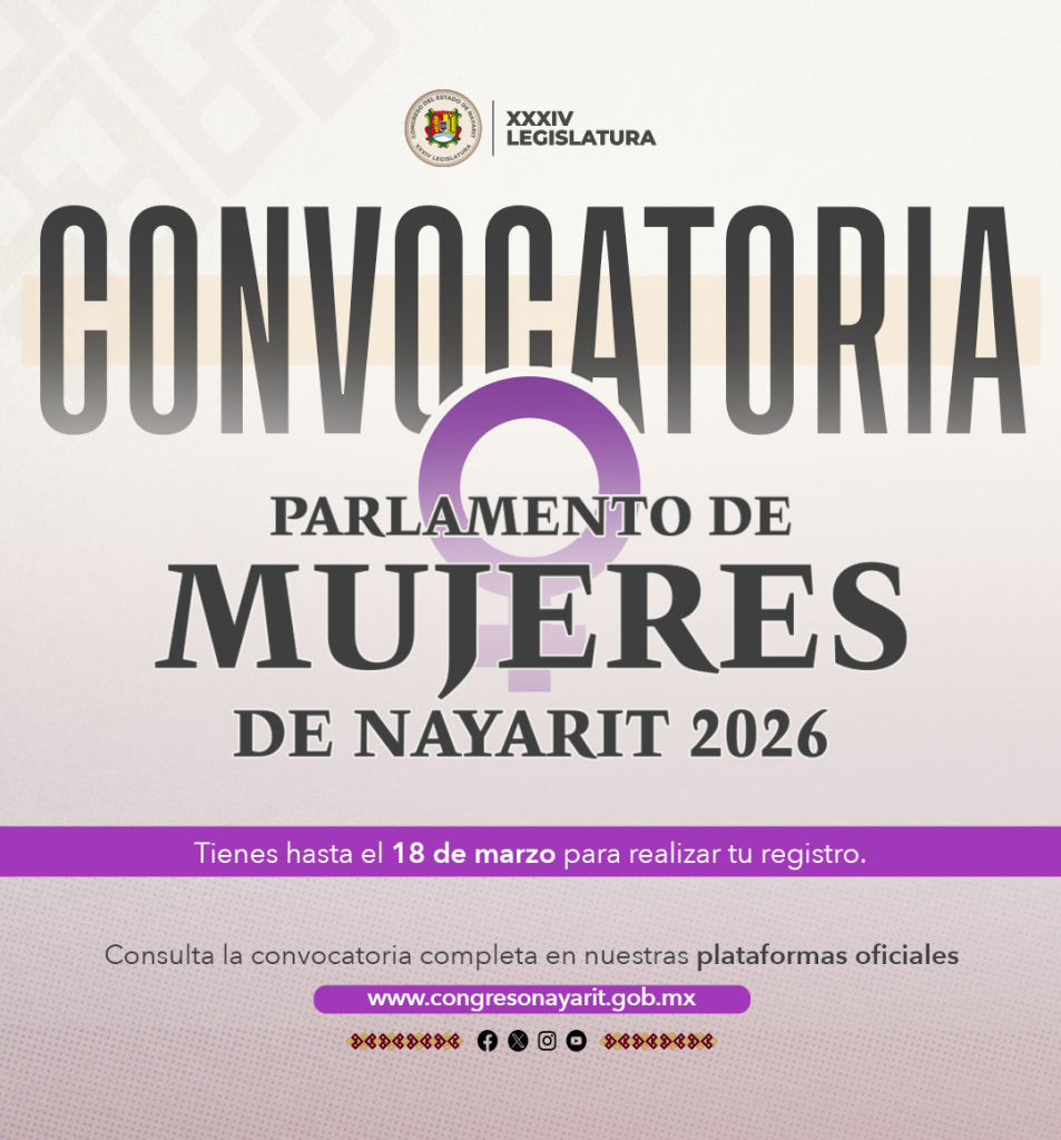 Parlamento de Mujeres Congreso de Nayarit marzo 11, 2026marzo 13, 2026Gcn NoticiasDeja un comentario en Parlamento de Mujeres 💜 ¡Haz que te escuchen! 💜Parlamento de Mujeres Nayarit 2026Inscríbete: www.congresonayarit.gob.mx🗣️ ¡Es tu momento! 💜
