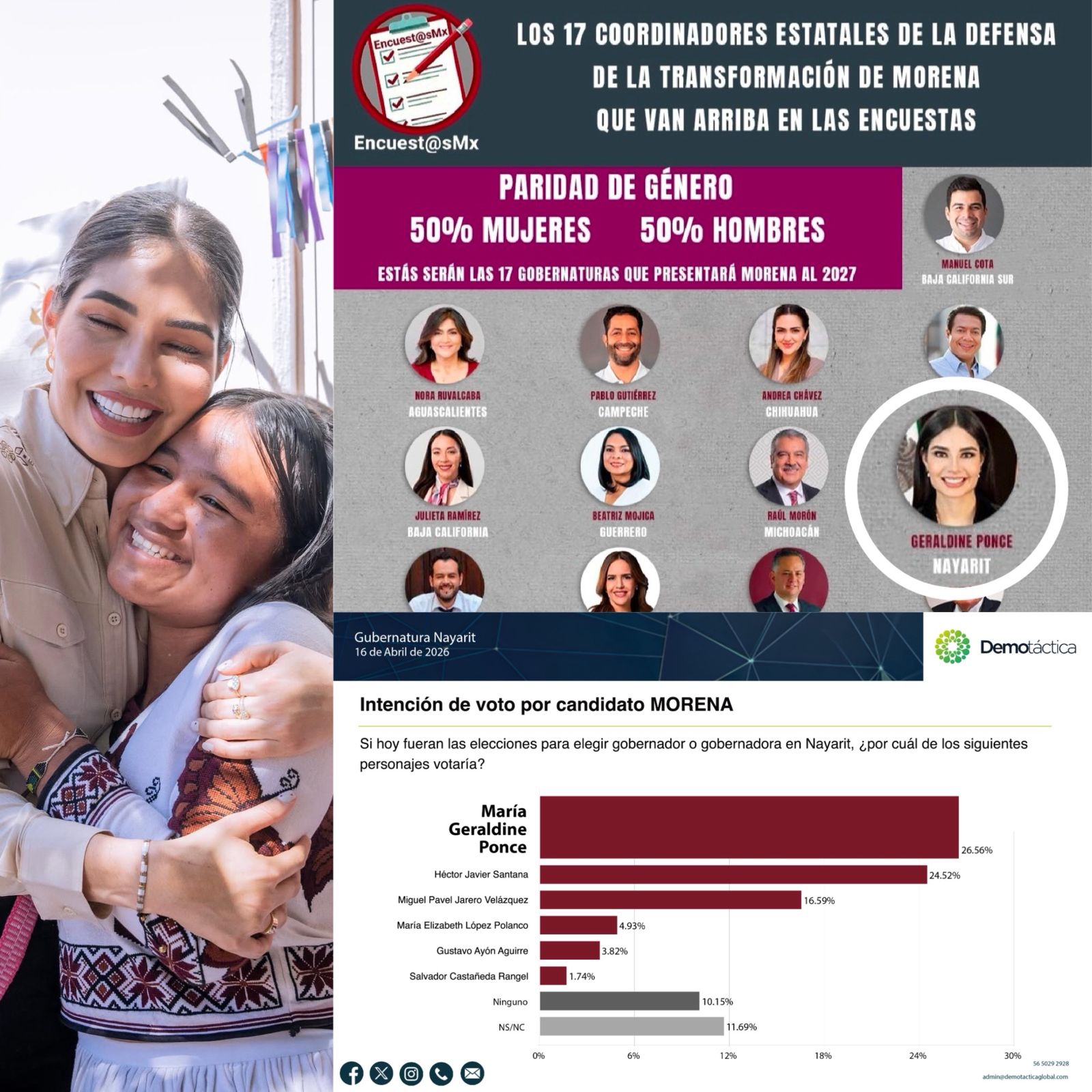 Tepic.— Las más recientes mediciones de Encuest@smx y Demotáctica coinciden en ubicar a la presidenta municipal de Tepic, Geraldine Ponce, como el perfil mejor posicionado de Morena en Nayarit, destacando tanto en intención de voto como en escenarios de definición interna rumbo a 2027.