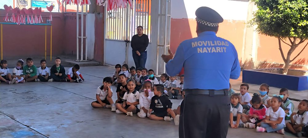 Agentes de Movilidad de la delegación de Tuxpan y personal del departamento de Cultura Vial de esta secretaría, capacitaron a niñas y niños del preescolar «Laureles y Gongora», del municipio de Tuxpan, sobre la importancia del cruce seguro, el significado de los colores del semáforo y las señalizaciones viales.